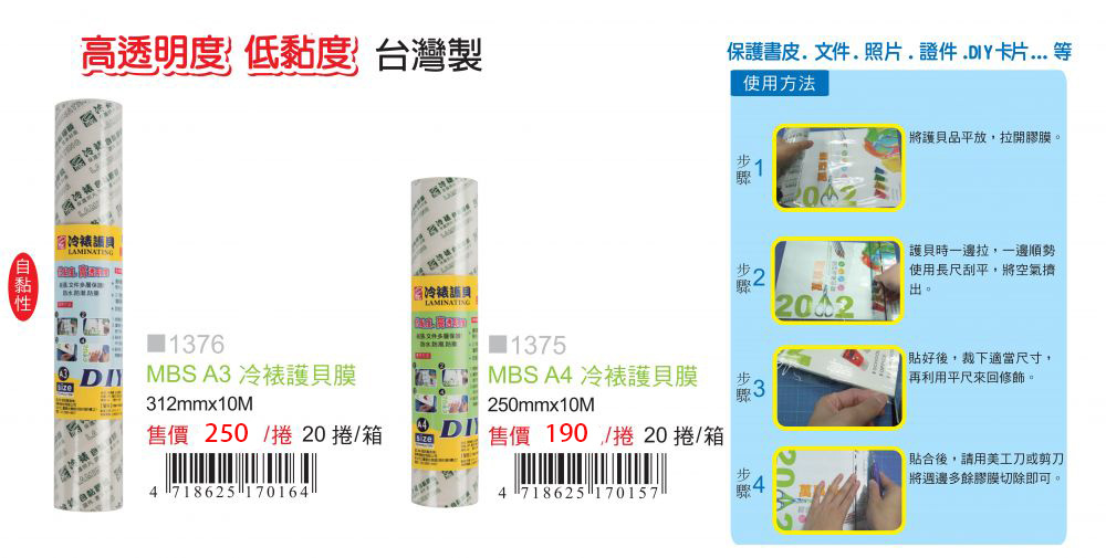 * 保護書皮.文件.證件.DIY卡片..等 * 免加熱 免用護貝機 * 低黏度 使用不沾黏 * 台灣製造 * 材質 OPP...